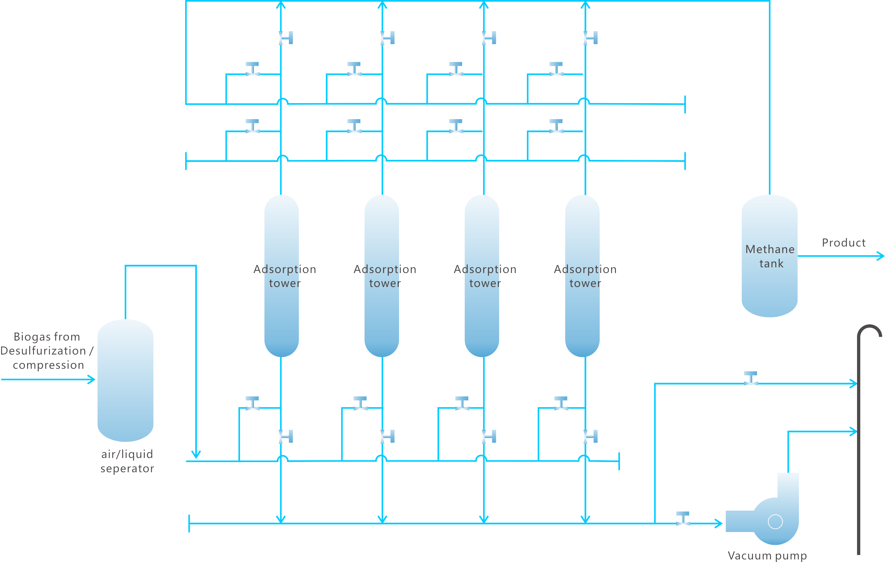 Technological processThe biogas is desulfurized and compressed, pressurized, and then decarburized and purified by pressure swing adsorption (PSA) to obtain product gas.