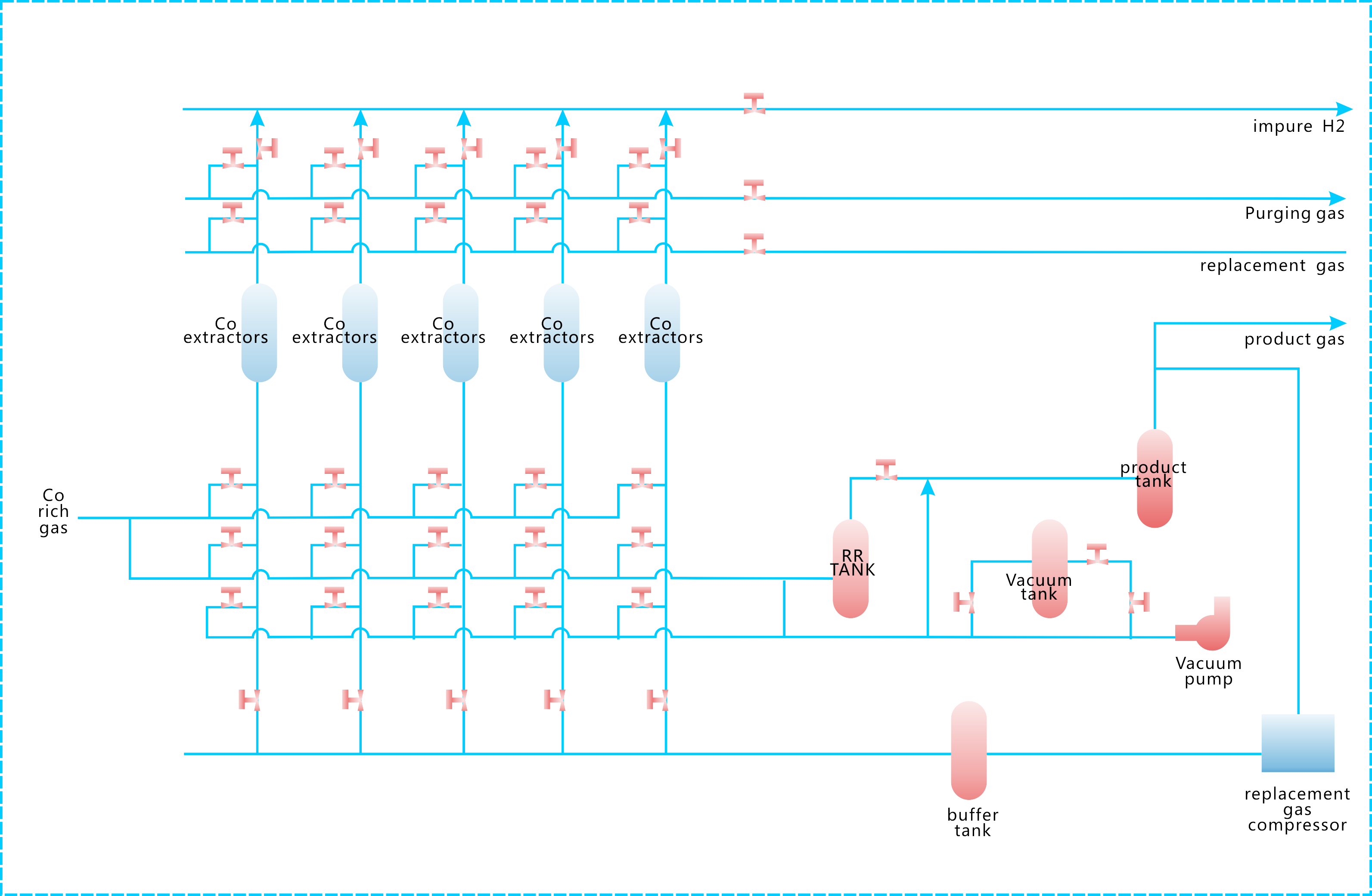 Purify CO with PSA technology and obtain product CO from desorption phase; The adsorbent for purifying CO is developed by our company. It has large adsorption capacity, high selectivity, simple process, high purity and high yield of CO.