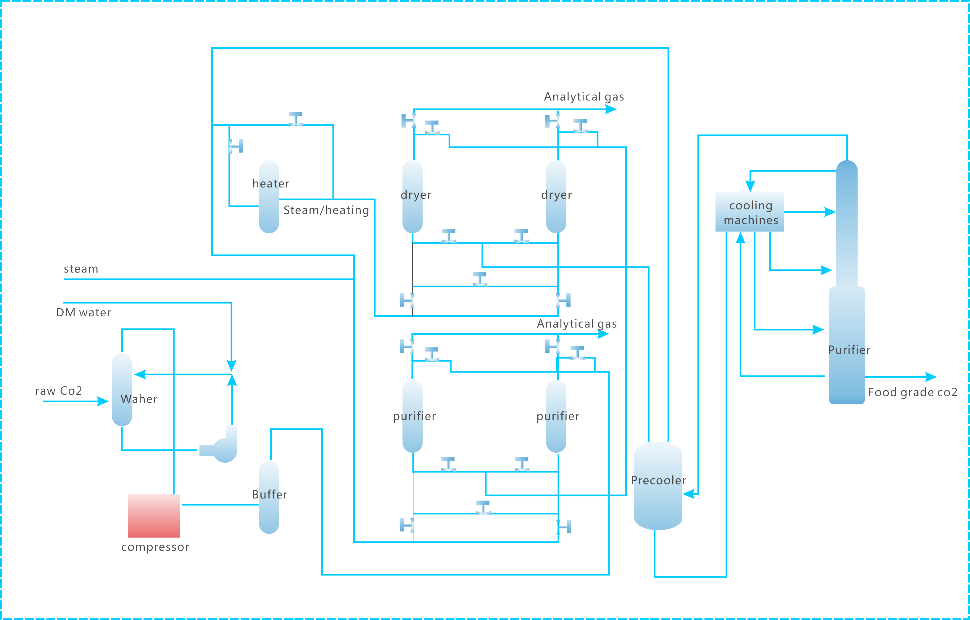 Technological processThe MDEA residue in the feed gas is removed after the raw material is washed with water, and then compressed, purified and dried to remove trace organic substances such as alcohol in the gas and remove the odor. After distillation and purification, the trace low boiling point gas dissolved in CO2 is further removed, and high-purity food-grade CO2 is obtained and sent to the storage tank or filled.