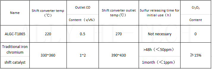 At present, the catalyst ALGC-T1865 has been put into use in a natural gas hydrogen production and hydrogenation integrated station. The heat exchange process at the outlet of high temperature reformer gas is highly integrated, and the hydrogen production is changed at the same time of heat exchange, so as to minimize the consumption of natural gas and produce less or no by-product steam. The inlet temperature of the shift converter can be as low as 220 ℃, the CO content in the outlet gas is less than 0.5v/v%, and the hydrogen conversion efficiency is increased by 2 ~ 3%. The wide temperature and environment-friendly medium low temperature shift catalyst ALGC-T1865 has the following advantages: