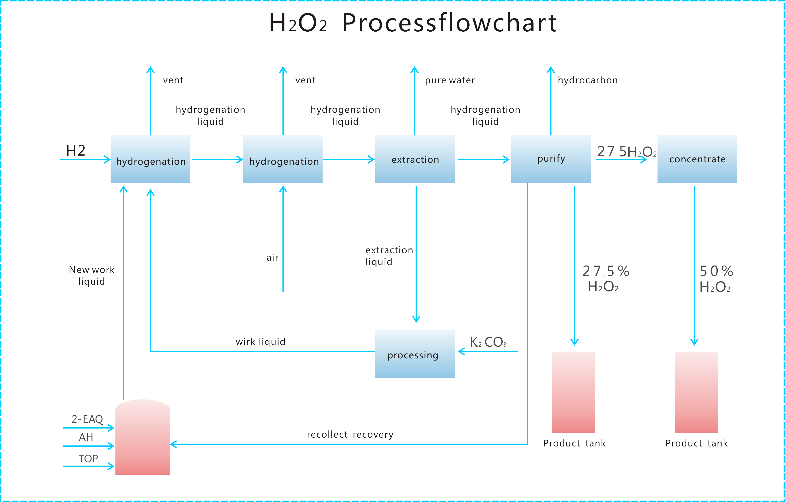 The production of hydrogen peroxide (H2O2) by anthraquinone method is one of the most mature and common production methods in the world. At present, there are 27.5%, 35.0% and 50.0% products in the market in China.