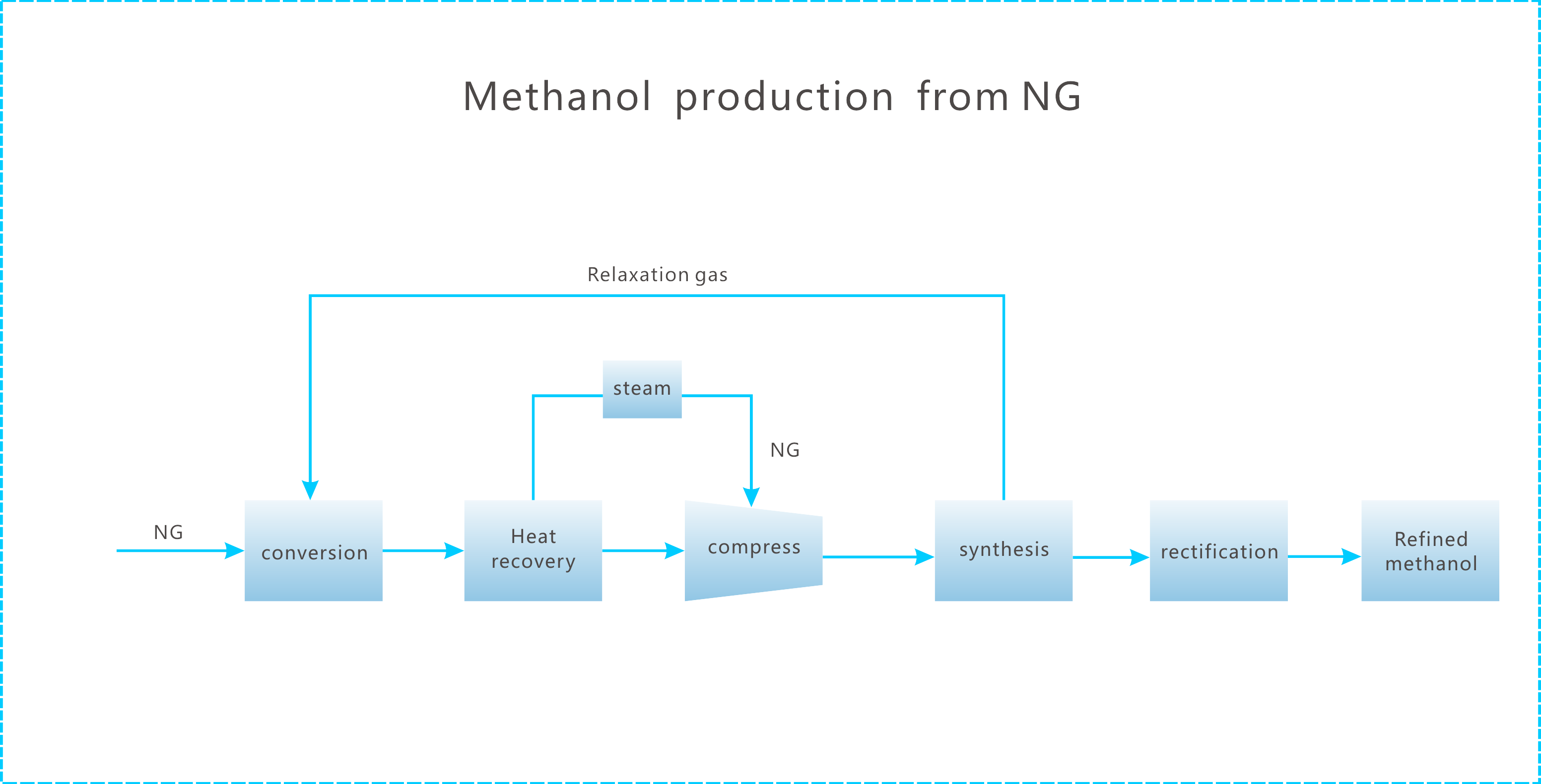 Technological processNatural gas is used as raw material to obtain syngas (mainly H2 and CO) through compression, desulfurization, purification and gas making. The syngas is further compressed and then enters the methanol synthesis tower to synthesize methanol under the action of catalyst. After the synthesis of crude methanol, the fusel is removed by pre-rectification, and the finished methanol is obtained by rectification.
