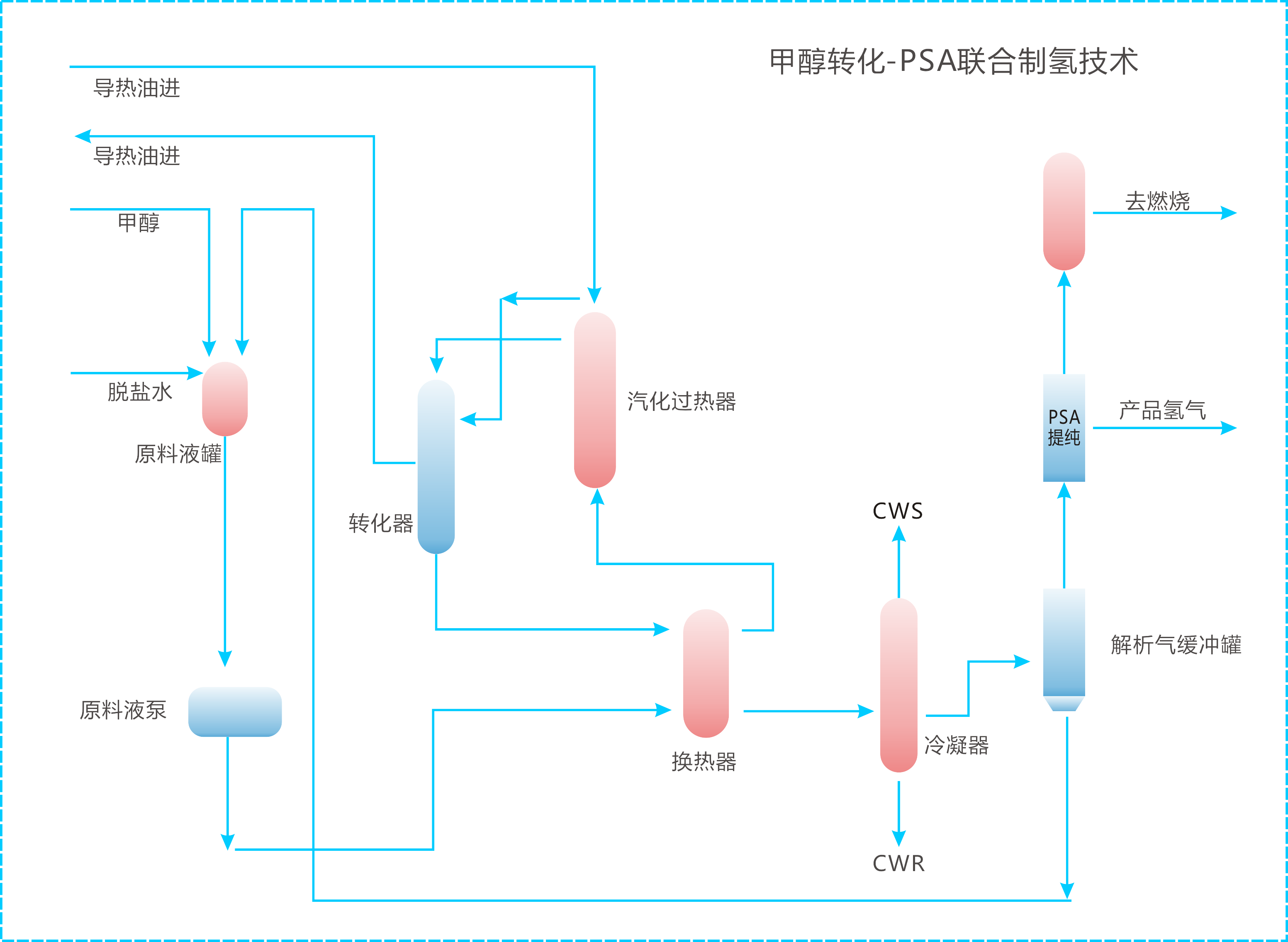 工艺流程甲醇和脱盐水经混合、加压、汽化、过热进入反应器,在催化剂作用下,反应生成H2、CO2、CO等混合气,混合气经变压吸附(PSA)分离技术一次性获得纯氢或高纯氢气