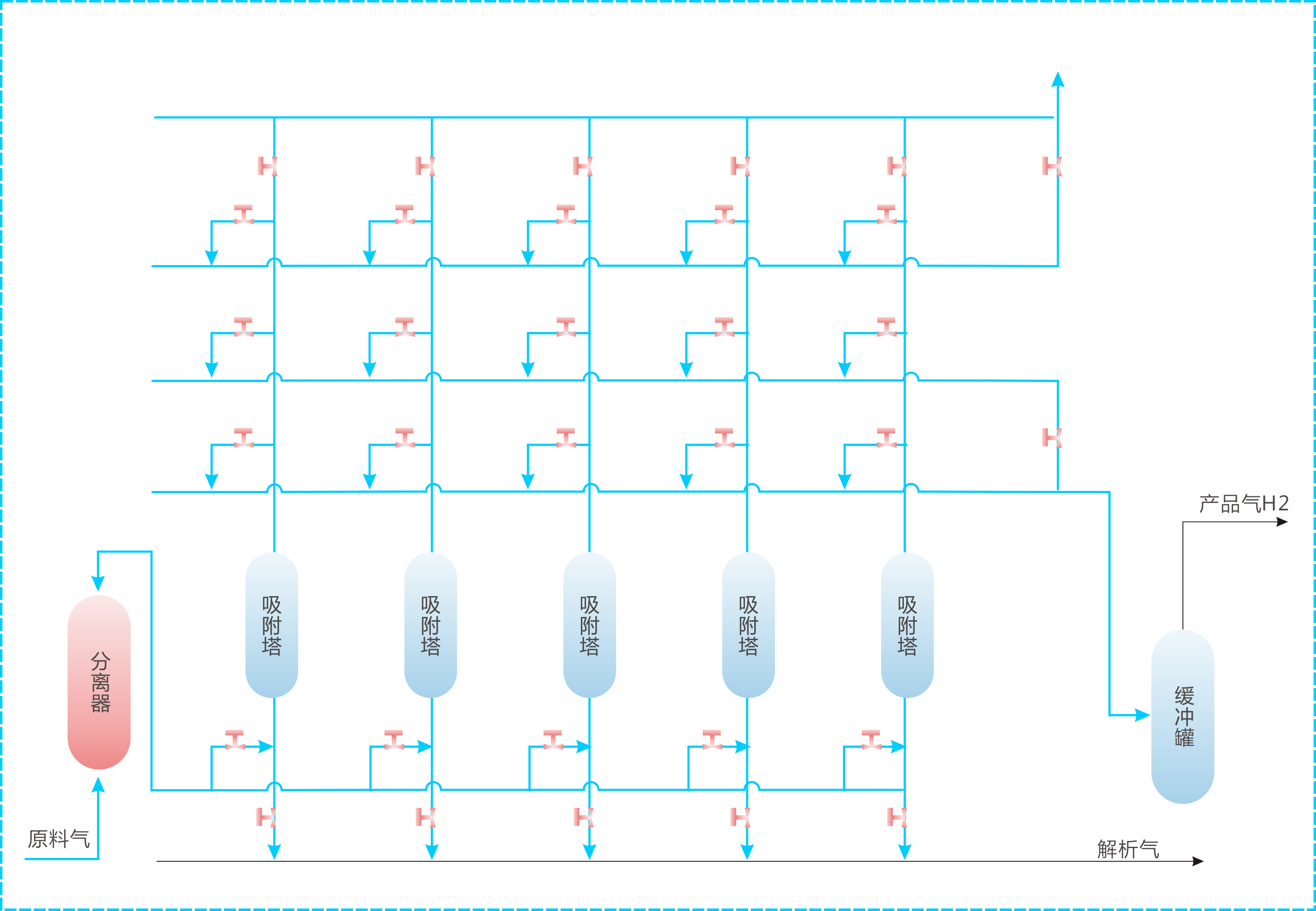 工艺流程氢气提纯采用多塔变压吸附技术。工作步骤分为吸附、降压、解析、升压等,吸附塔在工作步骤上相互错开,构成一个闭路循环,以保证原料连续输入和产品不断输出。